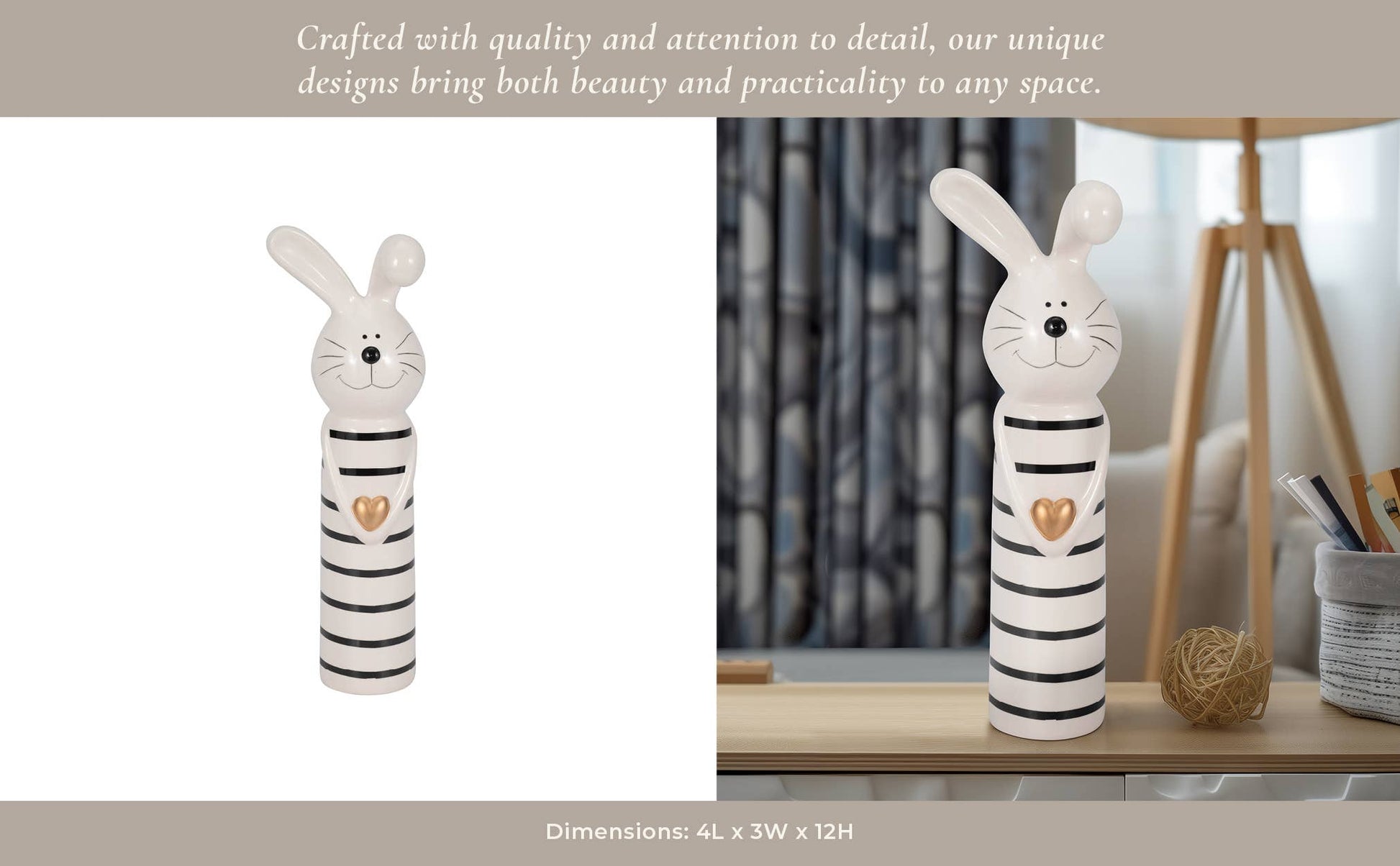 • ADORABLE BUNNY FIGURINE - Add charm to your space with this cute ceramic bunny! Featuring a modern black-and-white striped design with a golden heart accent, it brings warmth and personality to any home, office, or nursery decor.